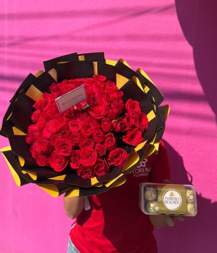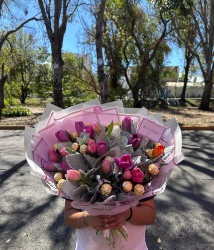 Hermoso ramo con 20 tulipanes, 20 chocolates y 5 rosas