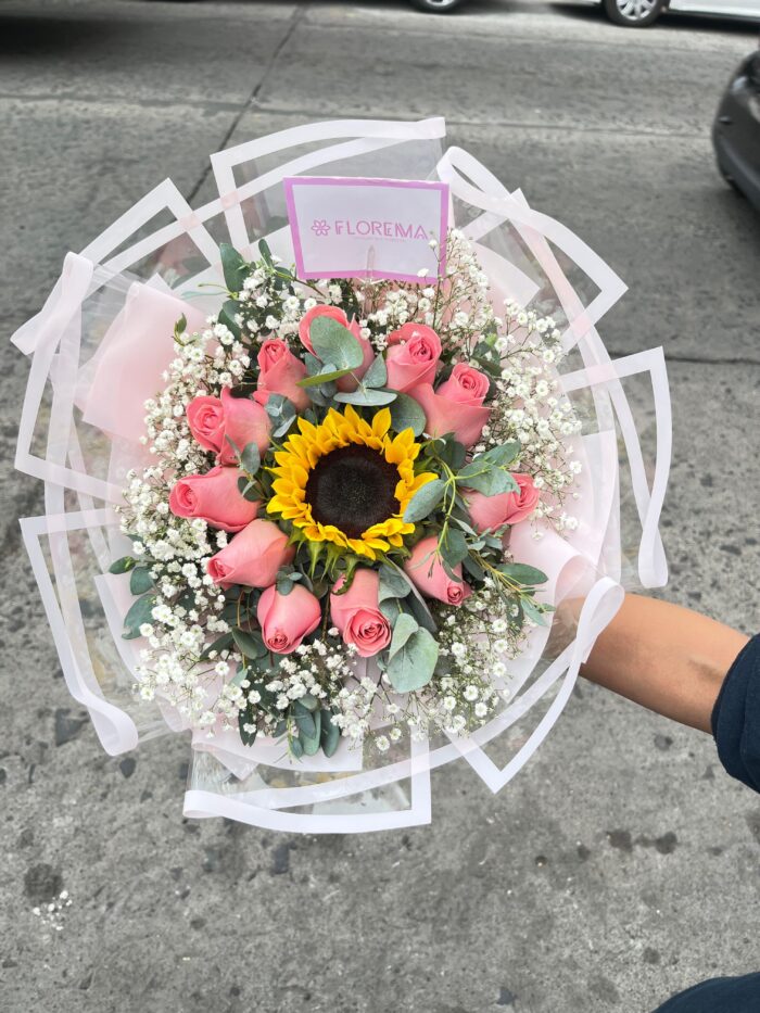 Ramo con 10 rosas rositas y 1 girasol