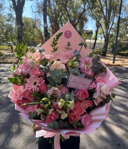 Impresionante canasta en tonalidades rosas con gerberas, rosas y claveles