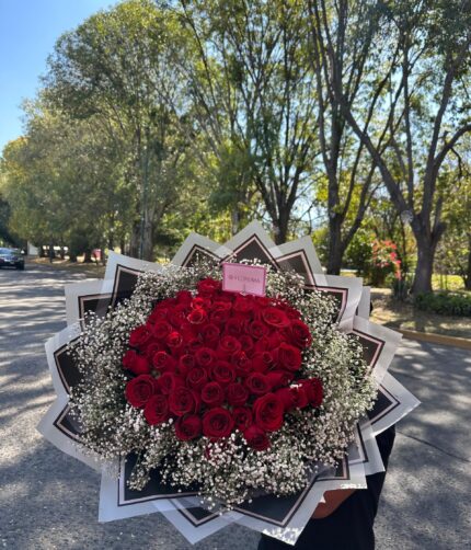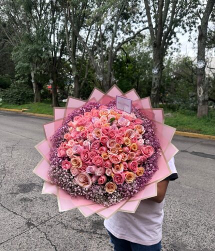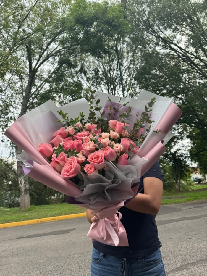 30 rosas rositas, con mini rosa y dolar.