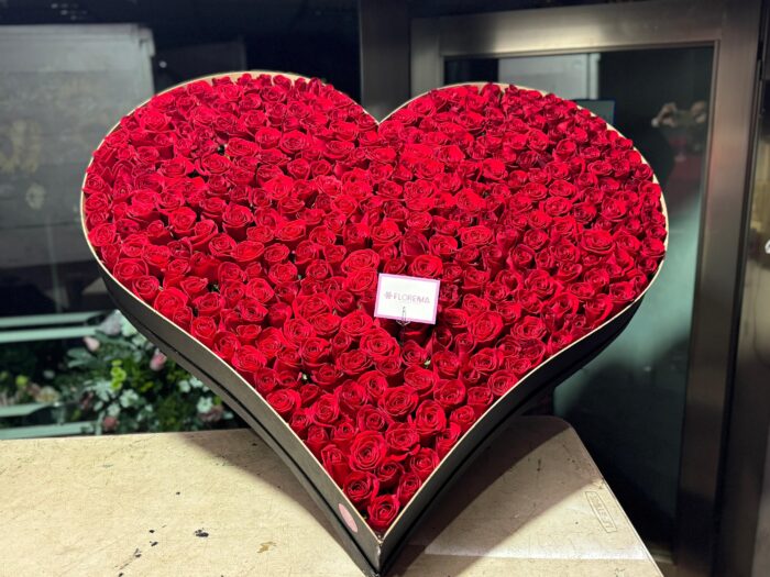 Elegante caja en forma de corazón con 40 rosas rojas y 12 finos chocolates en su interior